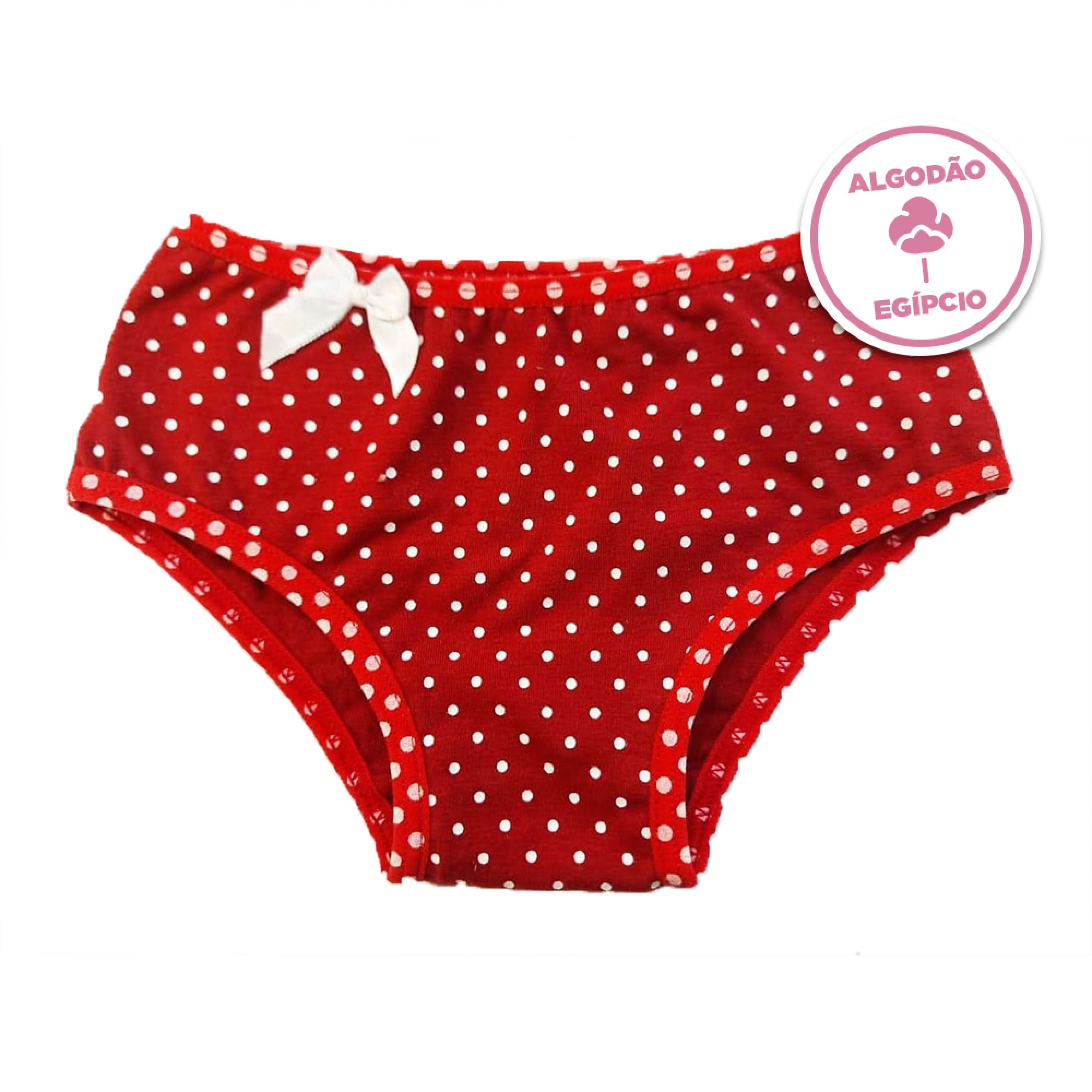 Calçinha Baby Estampada Poá na cor Rubi em algodão egípcio com viés de elastano com poliamina. Lateral e costas maiores, modelagem super confortável.