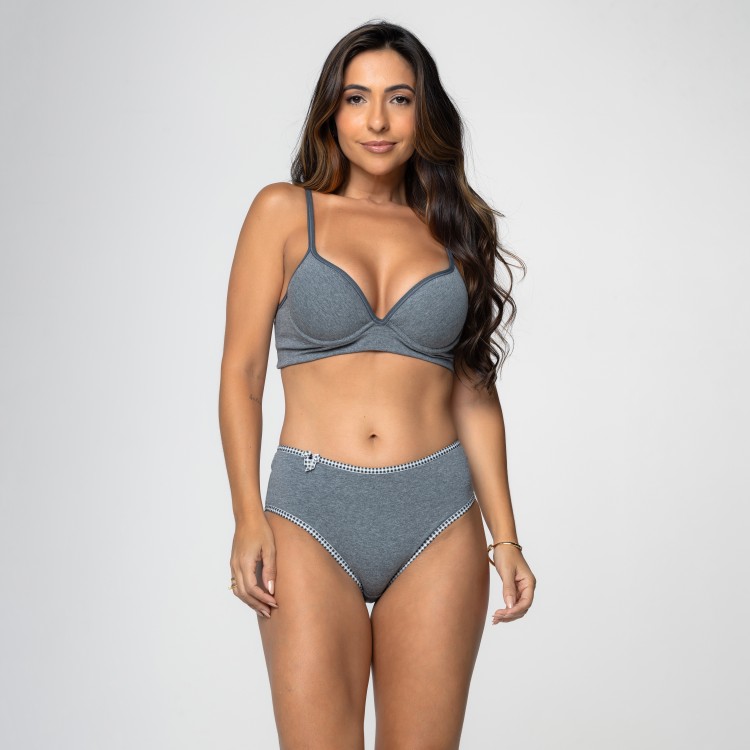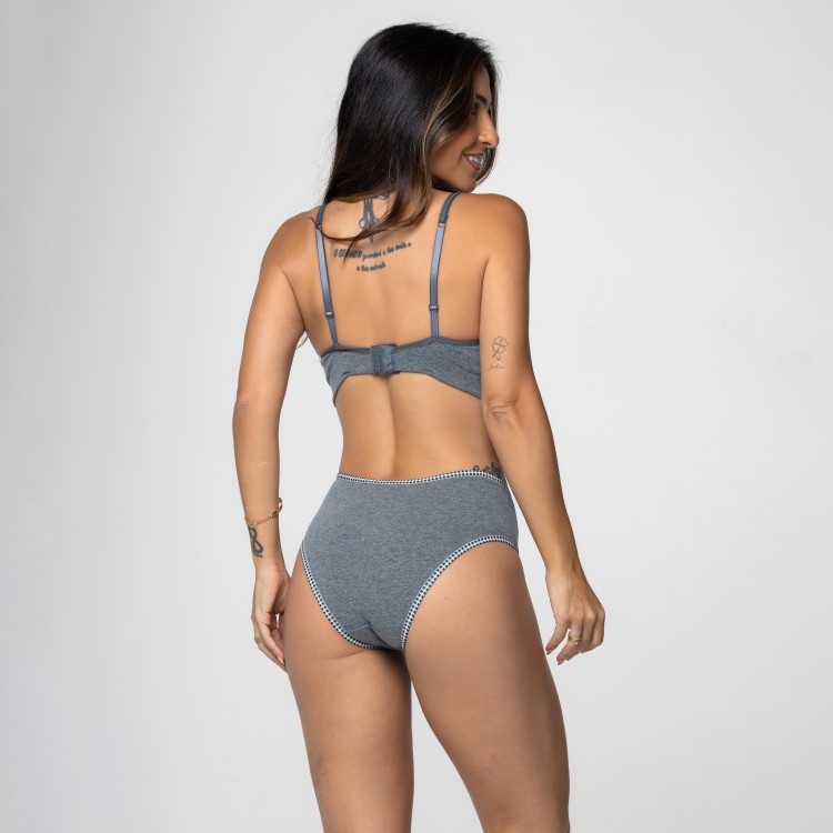 Esta calcinha na elegante cor cinza escuro destaca-se pelo delicado viés xadrez, que adiciona um toque de charme ao design clássico. O modelo oferece cobertura ideal e ajuste perfeito ao corpo, proporcionando conforto e bem-estar ao longo do dia.