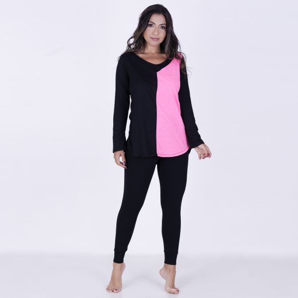 Pijama Longo Bicolor na cor preta com rosa pink confeccionado em algodão e poliéster. Composto por duas peças a blusa apresenta decote em "U", mangas longas , já a calça, em modelagem básica, tipo legging. Modelo ideal para boas noites de sono! Acompanha linda necessaire bicolor conforme a cor do pijama.