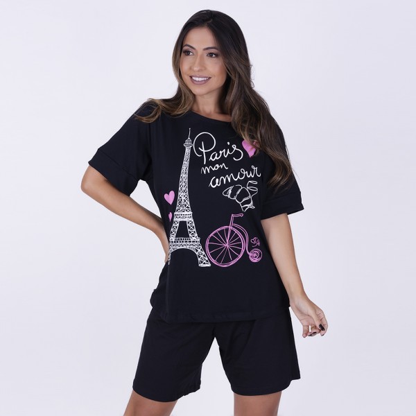 Pijama curto confeccionado em algodão e poliéster. Composto por duas peças a blusa apresenta decote em "U", mangas curtas e detalhe de estampa na parte frontal, bermuda, em modelagem básica, possui elástico e fita para amarrar. Modelo ideal para boas noites de sono! Acompanha linda necessaire.