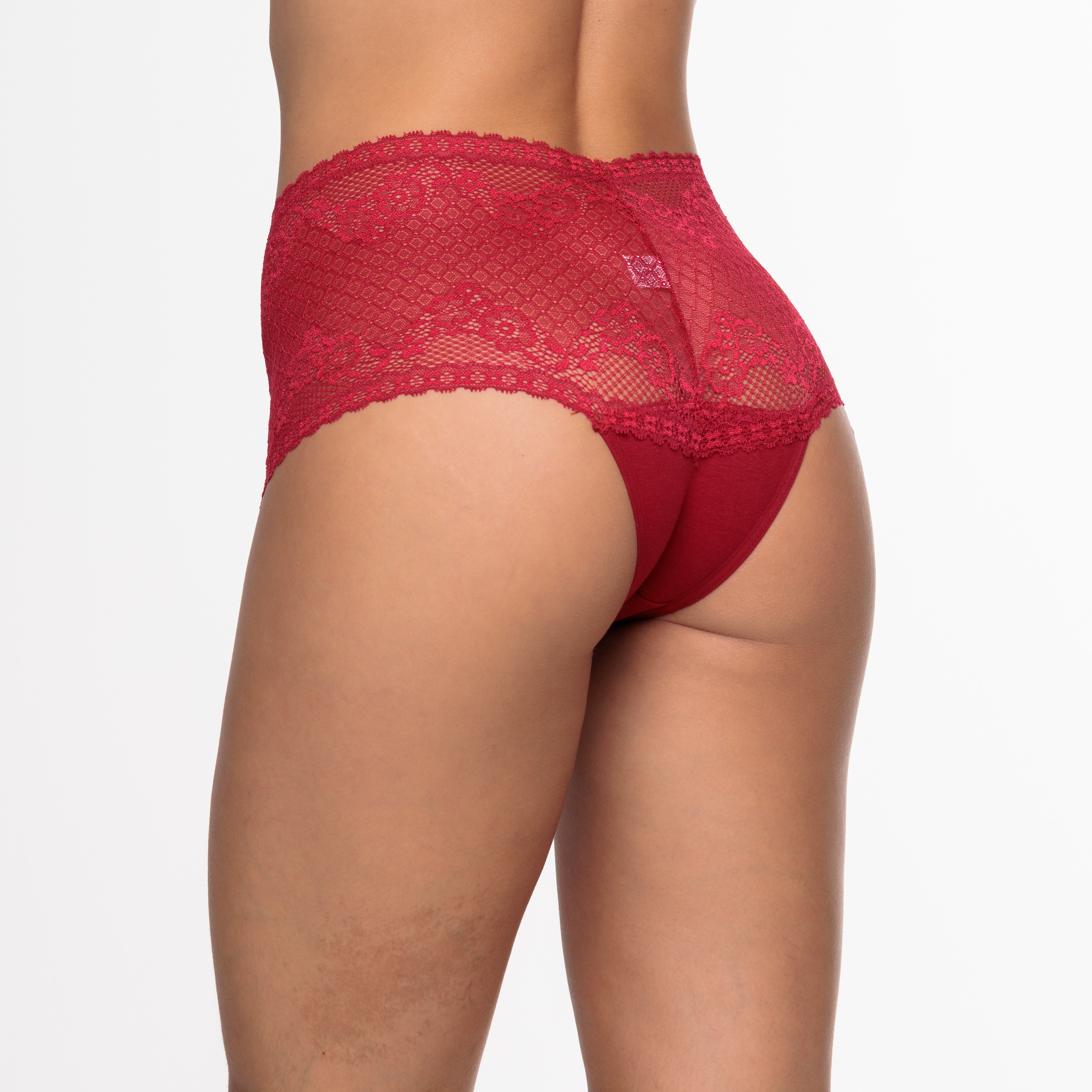 Caleçon na cor Rubi em algodão egípcio com viés em elastano e poliamida com renda larga na cintura e detalhe em laço com pedra Strass na frente.Modelagem super bonita no corpo.